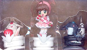 drei Schachfiguren: Mokona Bauern (1x weiß, 1x schwarz), Sakura