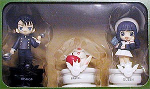 drei Schachfiguren: Mokona Bauer (weiß), Tomoyo Königin (weiß),